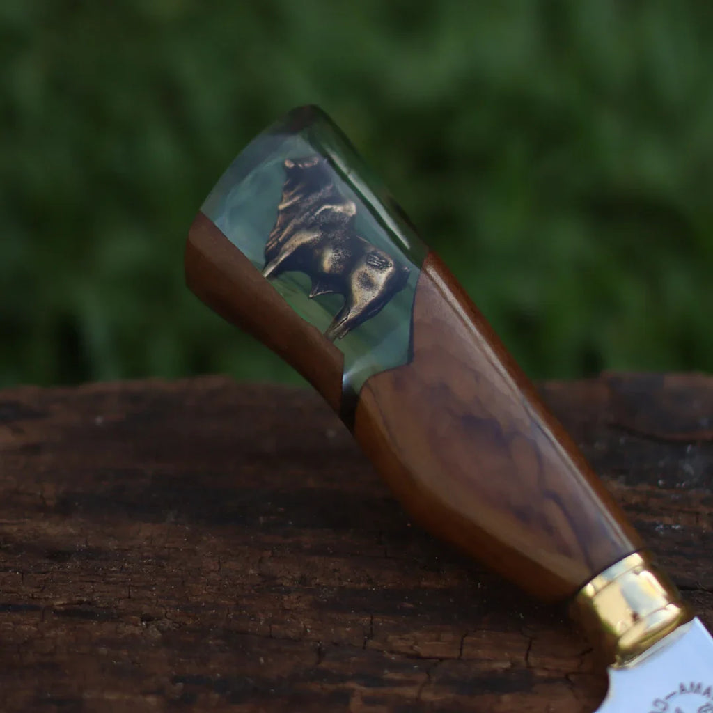Cabo em Madeira Nobre e resina antibacteriana (cor e textura podem conter pequenas variações por ser feita de maneira artesanal em matéria-prima natural).